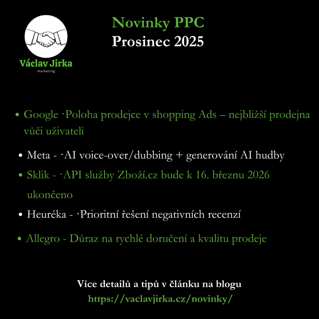 Pro marketéry a e-shopaře z toho plyne jasné ponaučení: automatizace a AI budou v roce 2026 hrát ještě větší roli. Kdo chce uspět, měl by využít nové funkcionality (AI kreativní nástroje, chatboti, API integrace) a sledovat změny algoritmů i pravidel na jednotlivých platformách.